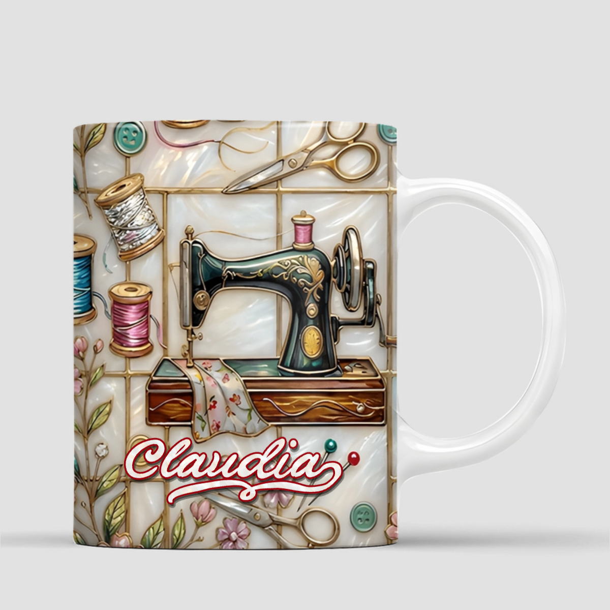 Diese wunderschöne, personalisierte Tasse im kunstvollen Stained-Glass-Look fängt genau diesen magischen Moment ein: Deine Leidenschaft für das Nähen und dein ganz persönliches Atelier!