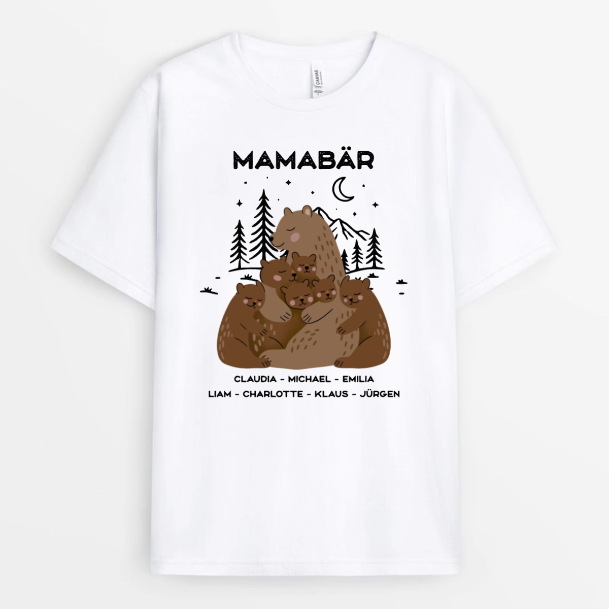 Dieses wunderschöne, personalisierte T-Shirt fängt genau diesen Moment der Geborgenheit ein. Mit den Namen deiner kleinen Bären wird es zu einem einzigartigen Unikat, das zeigt: Hier schlägt ein stolzes Mama-Herz! 🌲🌙