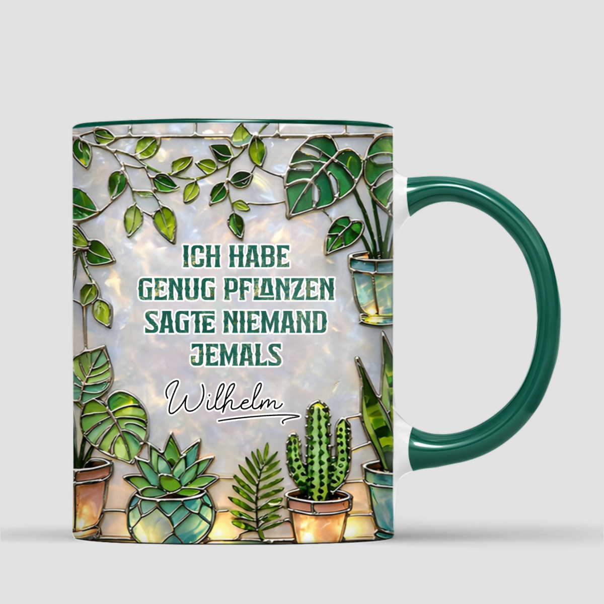Diese wunderschöne, personalisierte Tasse fängt genau diesen Zauber ein! Mit ihrem kunstvollen Design, das durch einen faszinierenden Stained-Glass-Effekt besticht, werden saftige Blätter und Kakteen in einer edlen Optik förmlich zum Leuchten gebracht. So wird jede Kaffeepause zwischen deinen grünen Lieblingen zu einem kleinen Luxusmoment.
