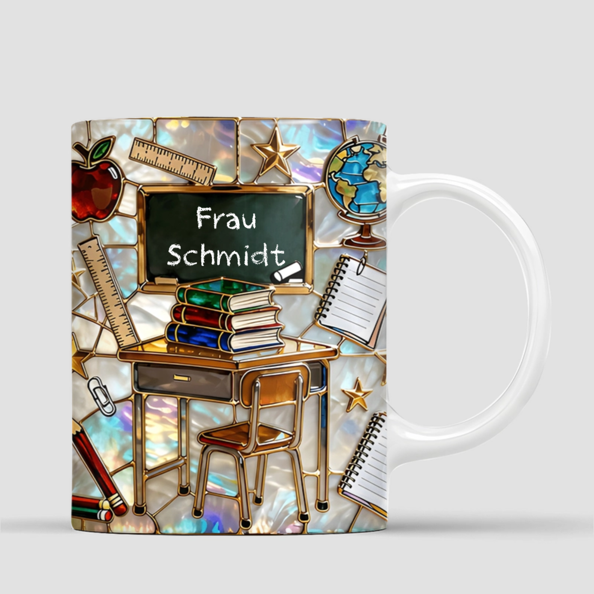 Mit dem kunstvollen Design im Perlmutt-Effekt, das eine nostalgische Schultafel, bunte Bücherstapel und Globen in einer edlen Optik vereint, wird jede Kaffeepause im Lehrerzimmer zu einem kleinen Luxusmoment. Überrasche die beste Lehrerin der Welt oder eine leidenschaftliche Grundschullehrerin mit diesem einzigartigen Geschenk. Es macht Frau Schmidt zum strahlenden Mittelpunkt ihrer verdienten Pause.