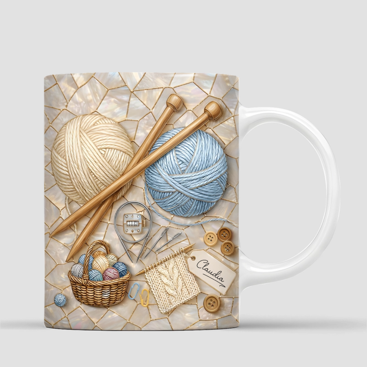 Diese wunderschöne, personalisierte Tasse fängt genau diesen Zauber ein! Mit ihrem detailreichen Design, das große Wollknäuel, klassische Stricknadeln und ein liebevoll gestricktes Maschenmuster in einer edlen Optik vereint, wird jede Pause in deinem Handarbeits-Paradies zu einem kleinen Luxusmoment.